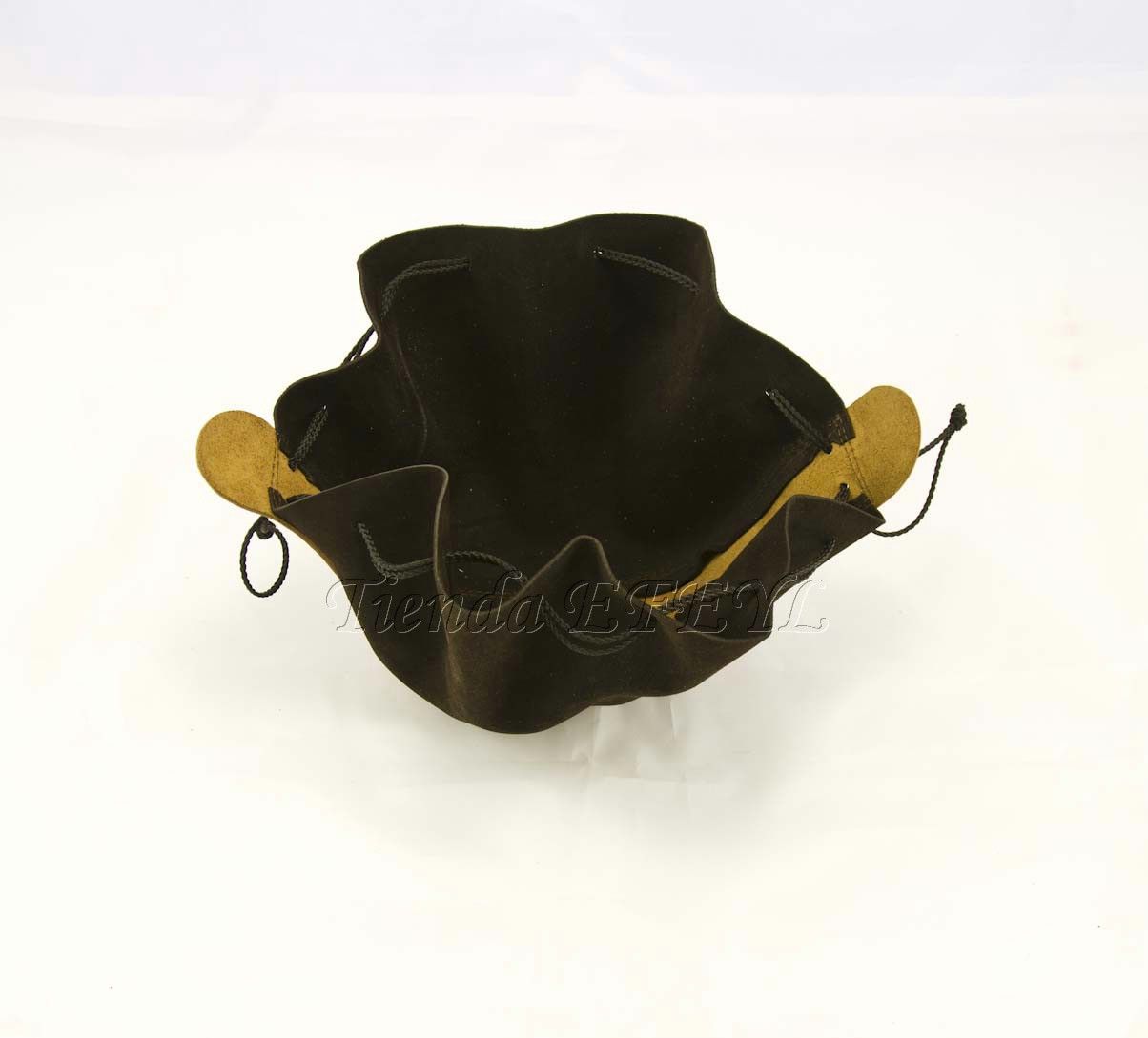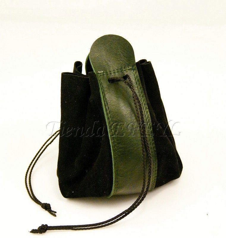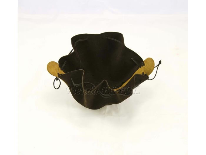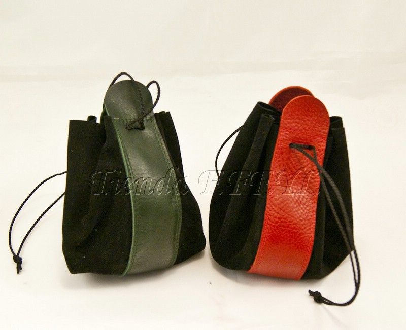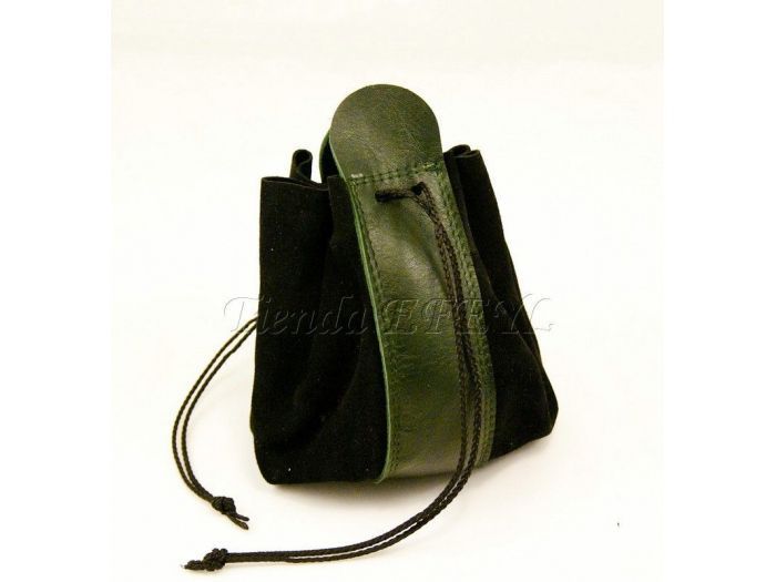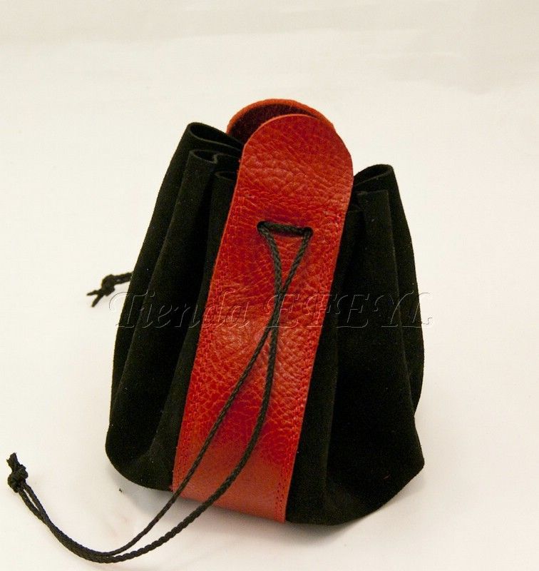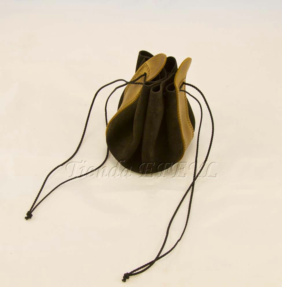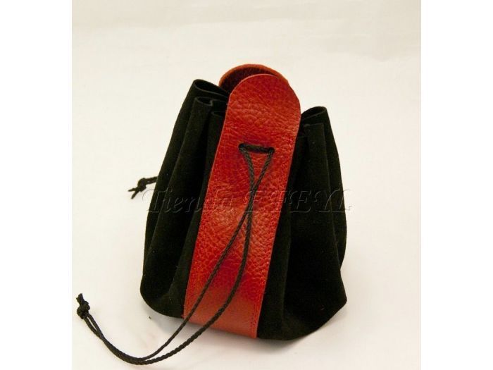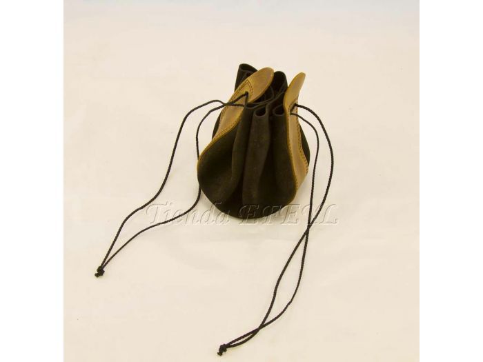 Bolsa de fabricación artesanal realizada en serraje y piel, que se cierra mediante cordones. Muy útil para el transporte de monedas o pequeños objetos.