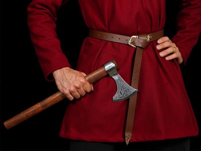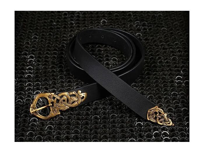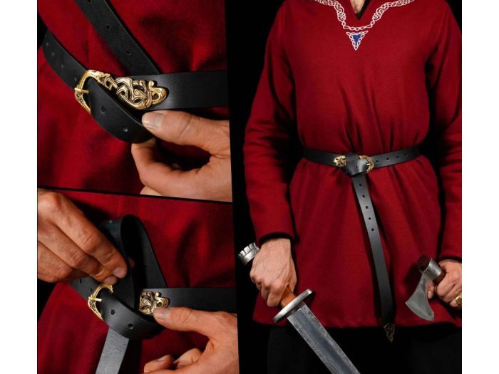 Cinturón medieval estrecho de cuero, decorado con una hebilla y terminación estilo vikingo.