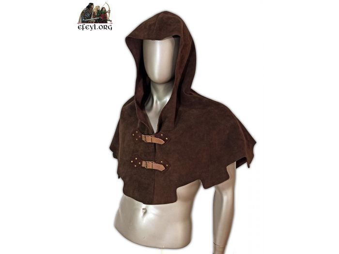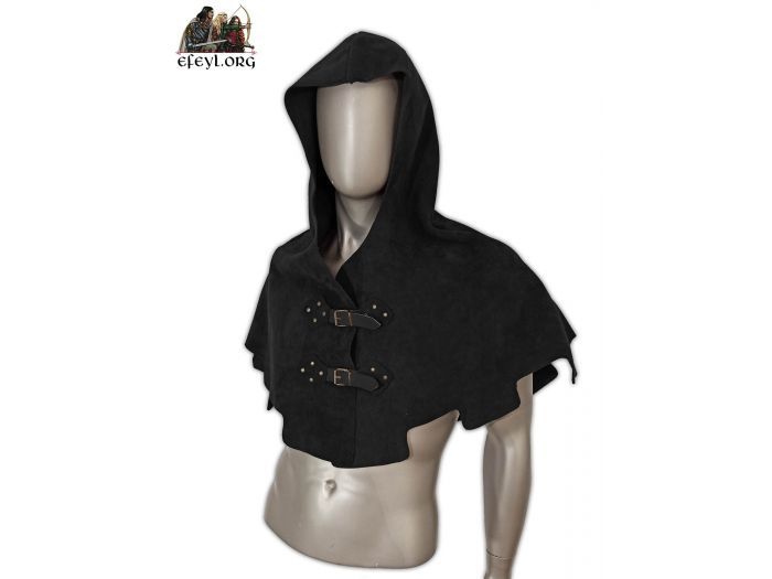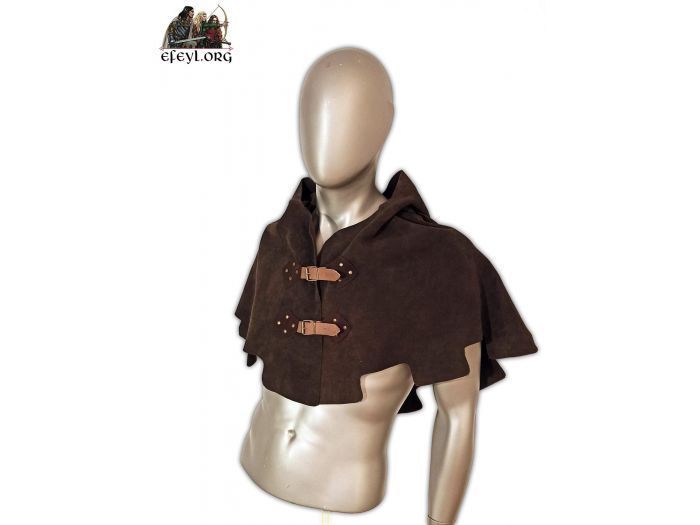Manteleta con capucha realizada en piel de serraje.