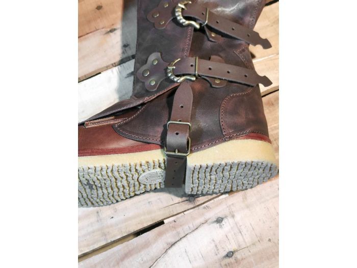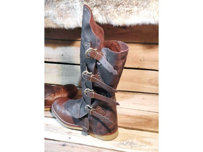 Par de polainas fabricadas en piel envejecida de alta calidad y cerradas mediante correas con hebillas.