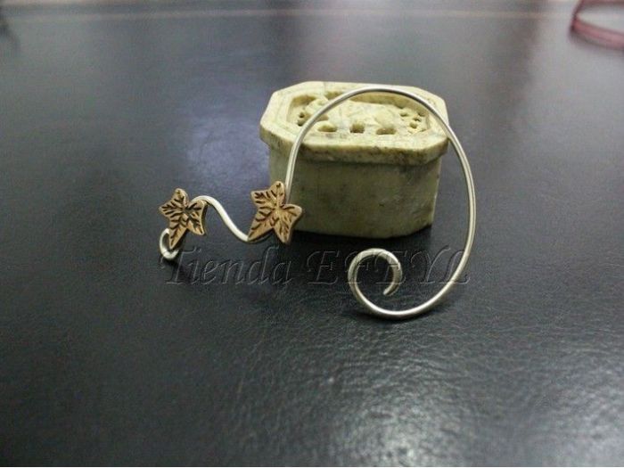 Aro artesanal para la oreja izquierda. Fabricado en alpaca con un magnífico acabado plateado. El aro queda sujeto a la oreja y se extiende sobre la mejilla.