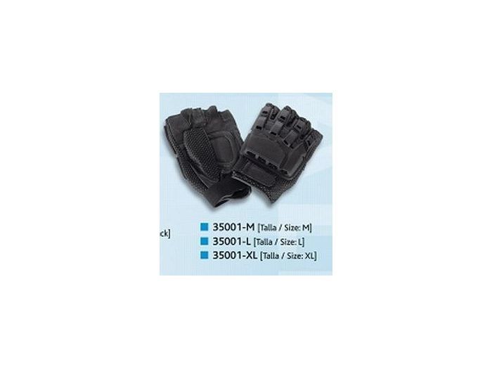 Guantes sin dedos con protección semirígida en el dorso de la mano, flexible en la palma y cierre de velcro.