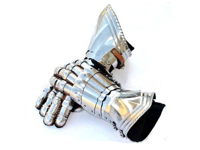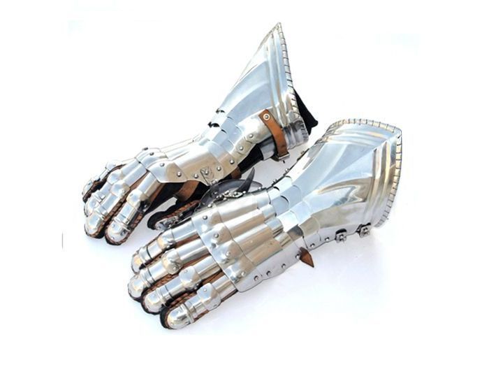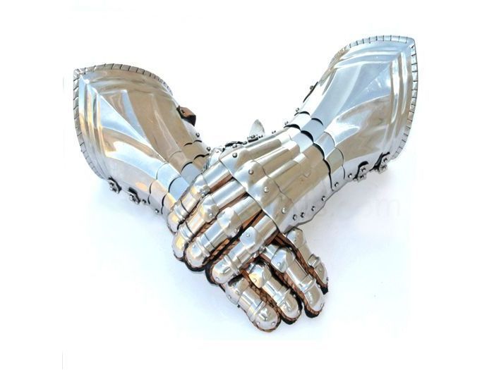 Guanteletes góticos articulados de armadura medieval con guante interior de piel y placas de 1,5 mm de grosor.