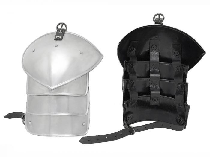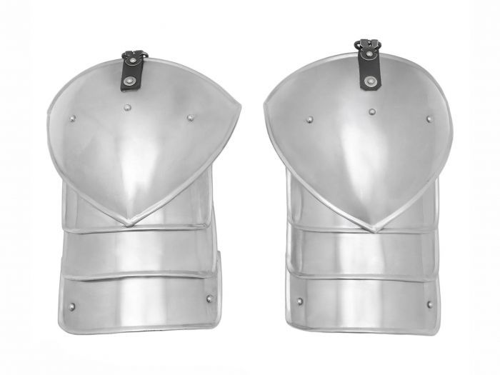 El metal tiene un grosor de 1-1,2 mm. Se fijan mediante correas de cuero negro a los brazos. Las correas son suficientemente largas para llevar las hombreras con un gambesón y cota de malla.