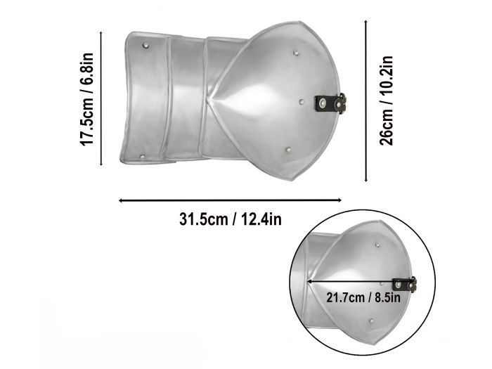 Su longitud total es de aproximadamente 31,5 cm y las placas del hombro de 21,7 cm y un ancho curvado de 26 cm. Las láminas de debajo tienen un ancho de 17,5 cm, proporcionando la protección esencial para los hombros y la parte superior de los brazos sin agregar peso innecesario.