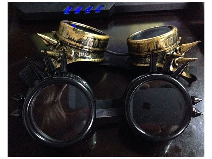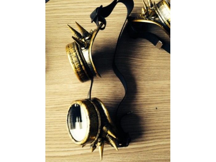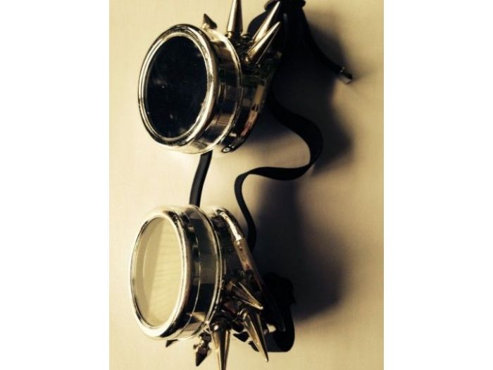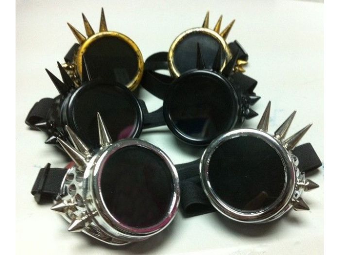 Goggles steampunk con cristales oscuros y remaches puntiagudos para pilotos steampunk. Se sujetan mediante una cinta elástica.