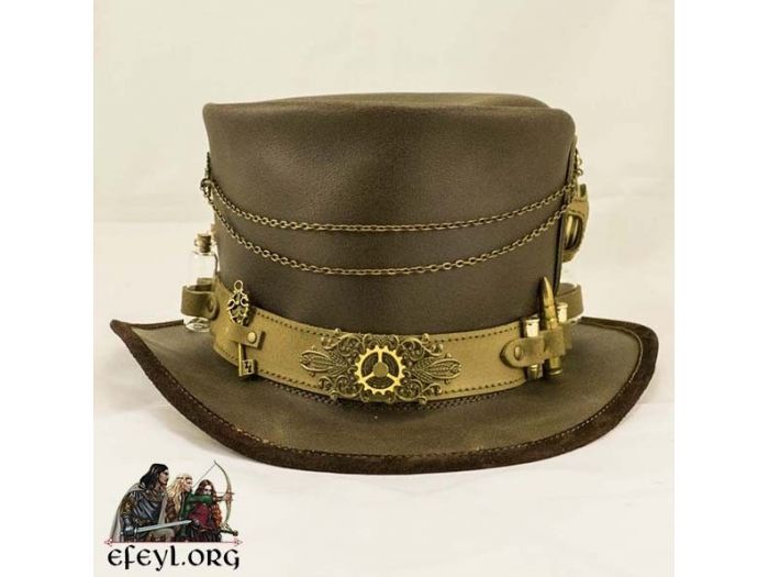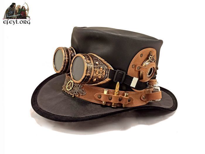 Sombrero de copa para los aventureros Steampunk, fabricado en piel artesanalmente y decorado con un reloj (perfectamente funcional), goggles, balas, viales de vidrio y toda una serie de pequeños y cuidados detalles decorativos en metal.