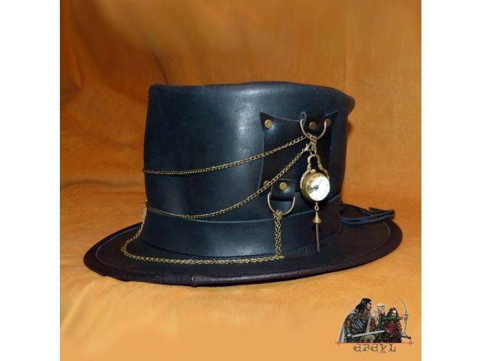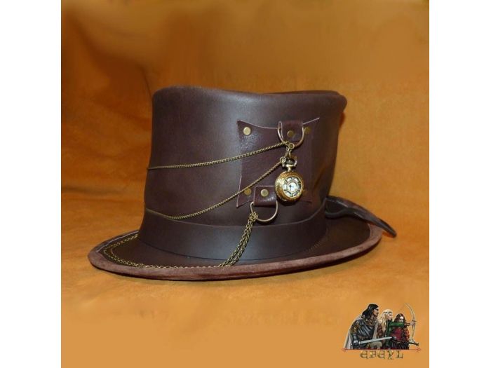 Elegante sombrero de copa de estilo Steampunk, fabricado en piel artesanalmente y decorado con relojes (perfectamente funcionales) y cadenas de bronce.